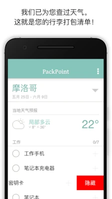 告别旅行前手忙脚乱的打包烦恼!PackPoint 是您专属的智能行李清单规划师,让您的每一次出行都轻松有序。只需简单输入您的目的地、出发日期及逗留天数,PackPoint 便能立即为您量身定制一份详细、周全的打包清单,确保您不会遗漏任何重要物品,让旅行准备成为一种享受。